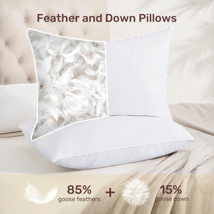 Feather Down Pillows Standard Size Set of 2, Luxury Soft Feather Pillows for Sleeping, Smooth Down-Proof Fabric, Hotel Collection Bed Pillows Surround Fill Polyester (White, 20″x26″)
